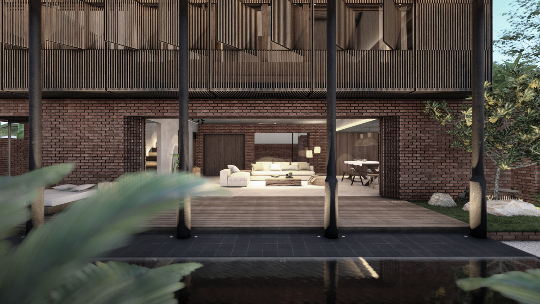 Red bricks combined with ulin timber screens on the second floor bring the rustic ambience that the owner desired. This screen creates a light diffusion through the enfilade leading to the bedrooms, which is punctuated with a window seat.